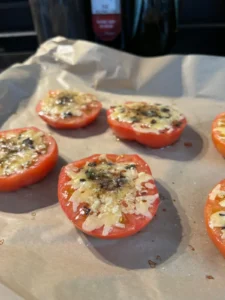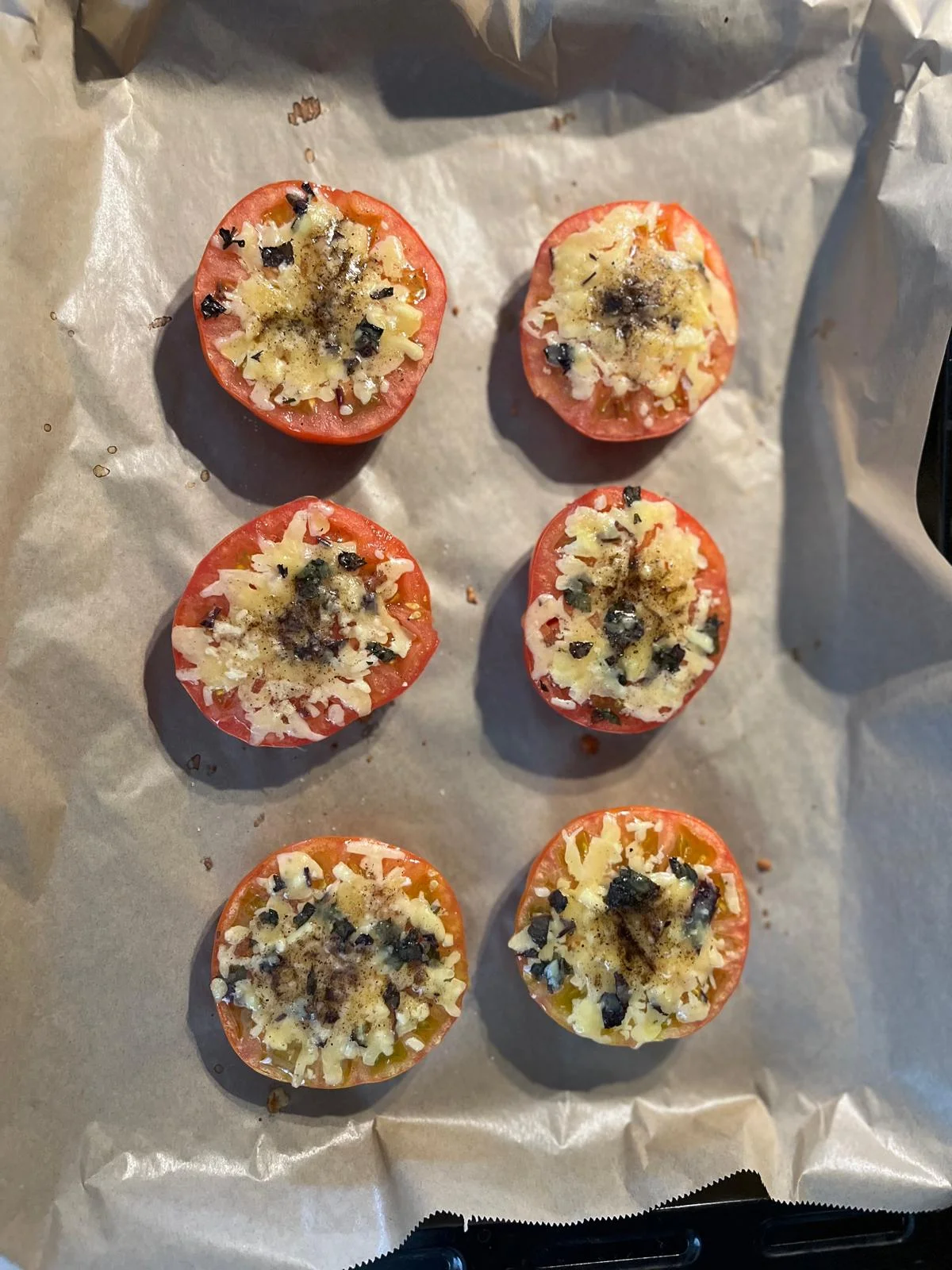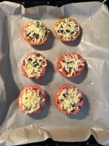 5- Domateslerin üzerine kaşar peyniri ve reyhan karışımı koyulur. Üstünden eritilmiş tereyağı gezdirilir. Tuz ve karabiber serpilir.