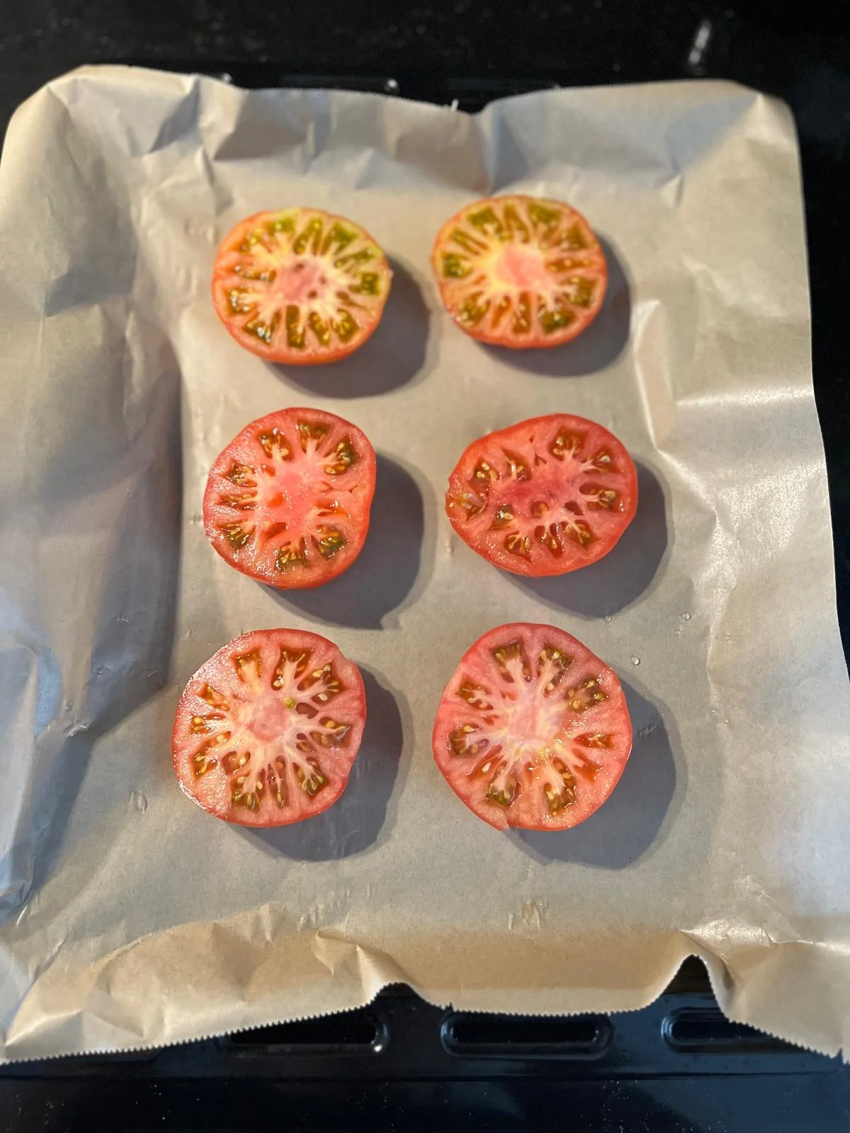 2- Tepsiye yağlı kağıt yerleştirilir. Ardından domatesler yağlı kağıt üzerine aralarında boşluk kalacak şekilde dizilir.